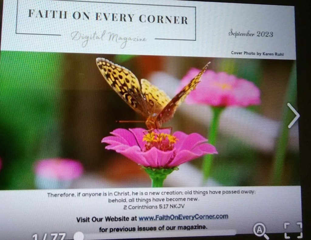 Hi my new article called Seasonal Changes In Life is out now. It’s in the digital Christian magazine called Faith on Every Corner. Hope you read and are blessed. https://issuu.com/craigruhl/docs/faith_on_every_corner_-_September_2023_28. Posted byBrenda McDanielSeptember 1, 2023September 1, 2023Posted inChristianity, faith, hope, loveTags:Christian, Christianity, faith, hope, kindness https://myangelmyhero46891542.wordpress.com/2023/09/01/hi-my-new-article-called-seasonal-changes-in-life-is-out-now-its-in-the-digital-christian-magazine-called-faith-on-every-corner-hope-you-read-and-are-blessed/ Share this: Click to share on X (Opens in new window) X Click to share on Facebook (Opens in new window) Facebook Like Loading... Related Published by Brenda McDaniel I am retired and this is my first book. I have a B.S. in Psychology from VA Tech and M.S. in Counseling from Liberty University. View more posts